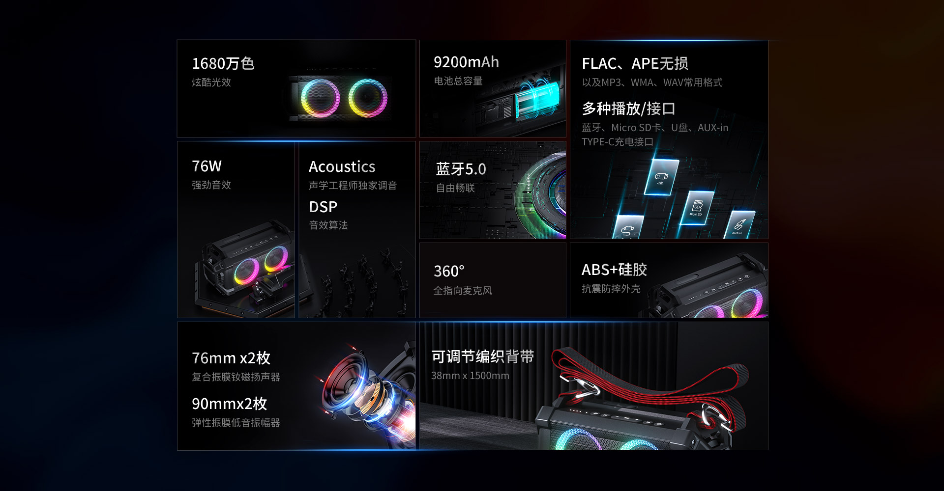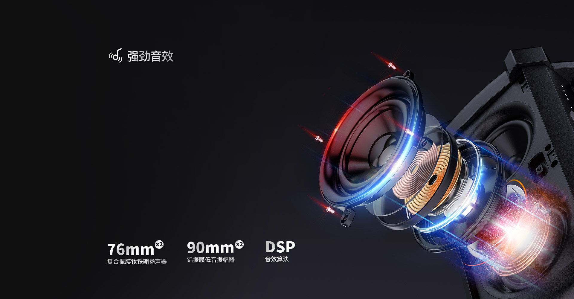 大容積聲學腔體內配置有2枚76mm復合振膜釹鐵硼揚聲器,